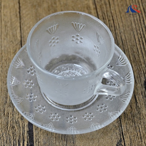 ファクトリーダイレクト高級エンボスガラスコーヒーマグ、ハンドルとソーサーティーカップ飲用タンブラーセットガラスカップセット